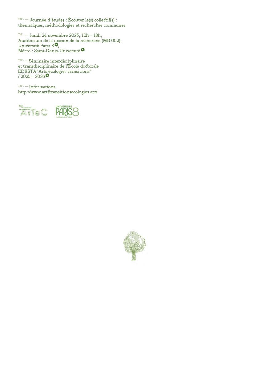 Journée d’études Lundi 24 novembre 2025, 10h—18h, Auditorium de la maison de la recherche (MR 002), Université Paris 8 Responsables : Ulysse Del Ghingaro, Noémie Favennec-Brun, Makis Solomos et le collectif de Paris 8 Arts, Écologies, Transitions (…)