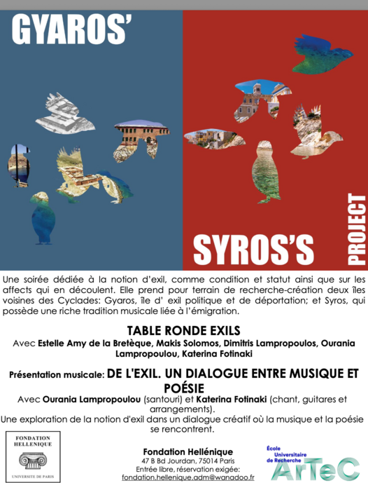 Soirée organisée dans le cadre du projet Syros-Gyaros. Affects d’exil et créations narratives et artistiques (financé par l’EUR ArTeC). Cet événement se penche sur la notion d’exil, comme condition et statut ainsi que sur les affects qui en découlent. Il prend pour terrain de recherche-création deux îles voisines des Cyclades : Gyaros, une île déserte connue pour avoir été par le passé un lieu d’εξορία (exil politique, déportation) et Syros, qui possède une riche tradition musicale liée à des questions de ξενιτιά (exil économique).