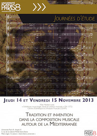 S’il est vrai qu’un clivage semble s’e ?tre instaure ? entre les deux rives de la Me ?diterrane ?e — clivage qui concerne aussi bien la pre ?gnance de la tradition que la vitalite ? des musiques populaires ou que les dynamiques de la modernite ? —, des correspondances concernant l’e ?criture musicale contemporaine dans son rapport au mate ?riau traditionnel peuvent et doivent e ?tre observe ?es et analyse ?es. C’est pourquoi les Journe ?es d’e ?tude organise ?es les 14 et 15 novembre 2013 a ? l’Universite ? Paris 8 se pre ?sentent comme des ateliers d’e ?changes et de de ?bats lors desquels la parole sera donne ?e principalement aux compositeurs eux-me ?mes. Ni normatif, ni prescriptif, l’objectif de ces Journe ?es consiste a ? relever et de ?battre des proble ?matiques the ?oriques lie ?es aux diffe ?rentes expe ?riences de composition, suivant une conception a ? la fois transversale et plurielle du rap- port entre tradition et invention.